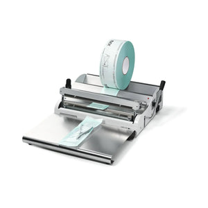 Impulse sealing device for packaging sterile products with acoustic sealing time signal and combined indicator light. Meets the requirements of DIN 58953-7. Suitable for all standard sterilization packaging with and without gusset.